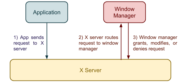 In the absence of a window manager, when an application wants to do something with a window - move it, resize it, show/hide it, etc. - its request is directly processed by the X server, and that’s the end of that. A window manager, however, needs to intercept these requests. For example, a window manager may need to know that a new top level window has been created and displayed, in order to draw window decorations (e.g. minimize / maximize / close buttons) around it. It may also need to know that an existing top level window has been resized, in order to redraw the window decorations to reflect the change.
