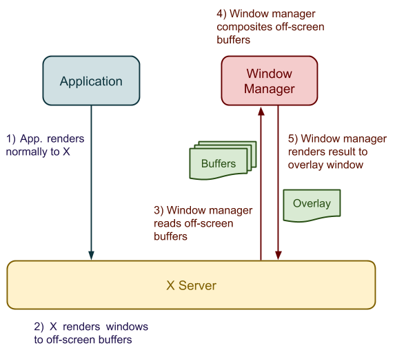 It is clear that none of this would be possible without some heavy cooperation from the X server. Enter the Composite extension: