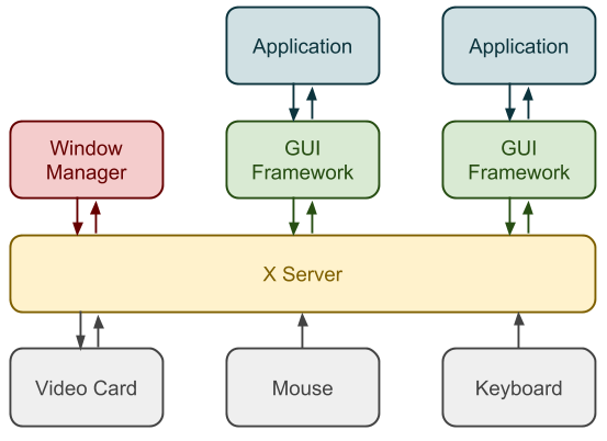 A window manager communicates with the windows it manages through two X mechanisms: properties and events. We will discuss these in detail in later sections, but the takeaway is that the communication happens through the X server, not directly between the window manager and other applications.